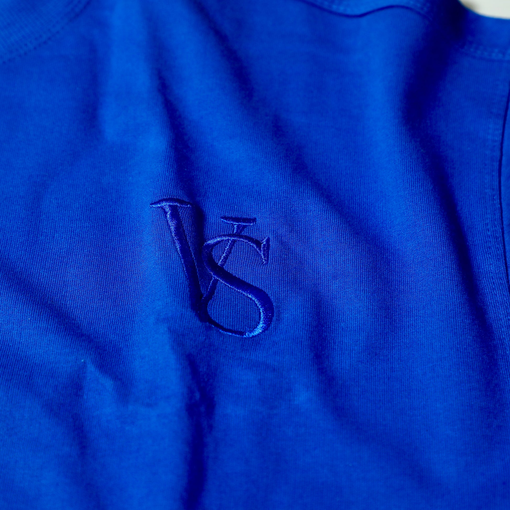 VELASTÉ Signature: The distinctive embroidered 'VS' logo is subtly and elegantly placed on the chest in a matching blue thread for a refined, branded finish.